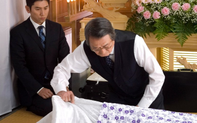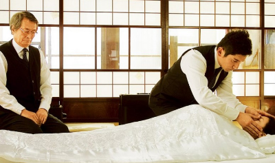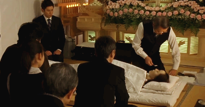 영화는 주인공이 시신을 대하고 납관하는 과정을 상당히 천천히 자세히 보여준다. 그 과정을 함께 보고 있자면 보는 사람도 숙연해질 수밖에 없다.
